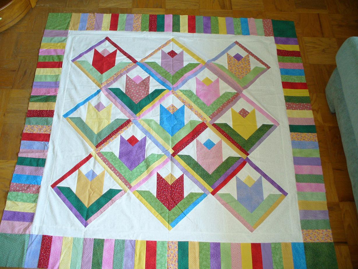 Some of you may remember that Momcat wanted to finish the Springtime Tulips top during her vacation in Virginia Beach. She did and here's the result. I really like the piano key border!